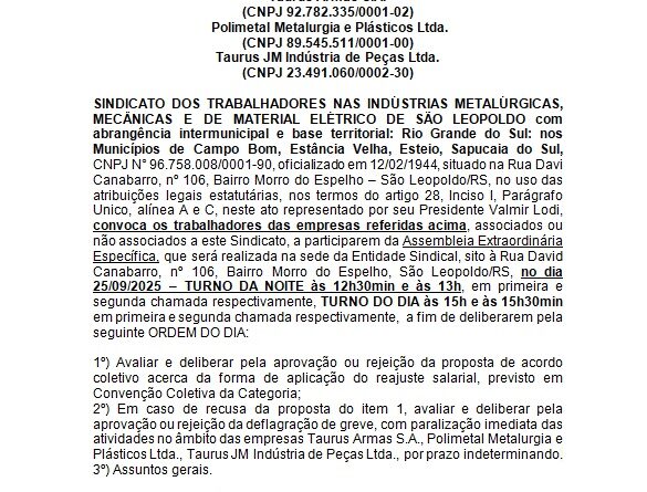 Read MoreO Sindicato dos Trabalhadores Metalúrgicos de São Leopoldo e Região (STIMMMESL) convoca as trabalhadoras e trabalhadores da Taurus para Assembleia